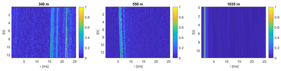 During the experiment, the PRBS probe signal was transmitted, based on m-sequences of order 8 and 10, repeated 500 times, and occupied frequency bands of 5 kHz, 8 kHz, and 10 kHz. The carrier frequency and the sampling frequency were equal to 30 and 200 kHz, respectively. Due to different propagation conditions and different transmission powers of the measuring system, the received signal to noise ratio (SNR) was different for each of the three measured channels. At a distance of 340 m, the SNR was in the range of 10 to 13 dB; at a distance of 550 m it was in the range of 13 to 18 dB; and at a distance of 1035 m the SNR was in the range of 32 to 35 dB.