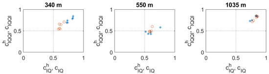 On the basis of the received signals, after performing a matched filtration, TVIR estimates and the corresponding coefficients and were determined. Next, the complex envelope of each of the received signal was divided into segments of a duration corresponding to the duration of a single PRBS sequence. The coefficients and were calculated as mean values over all segments of the probe signal. The minimum value of the coefficient is 0, and the maximum is 1. It is assumed that a value of the cross-coefficient above 0.5 means a strong similarity, and below 0.5 a weak similarity. This is consistent with the assumption of a stochastic model of the wireless communication channel, that two received signals are similar if their correlation coefficient is equal or greater than 0.5. This rule applies, inter alia, when calculating coherence time and the coherence bandwidth of the channel as a time interval and a frequency shift, respectively, for which the correlation coefficient of such delayed or frequency-shifted signals is equal or greater than 0.5 [19]. It is reasonable to assume that if values of both cross-coefficients: and are greater than 0.5, the channel can be described as a WSS process.