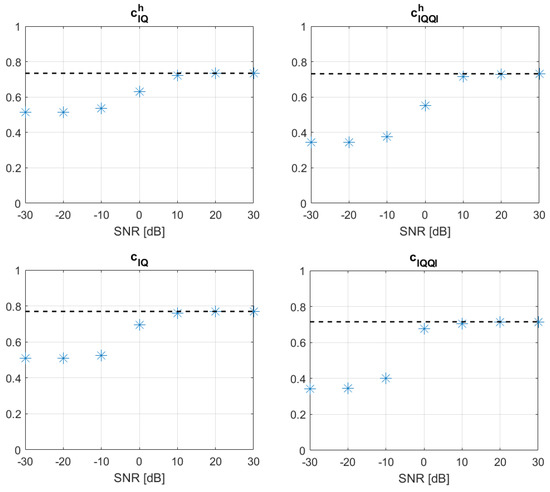 Correlation coefficients calculated on the basis of a signal received at a distance of 1035 m, disturbed by simulated AWGN; the dashed line represents the coefficient value obtained in the measurements.