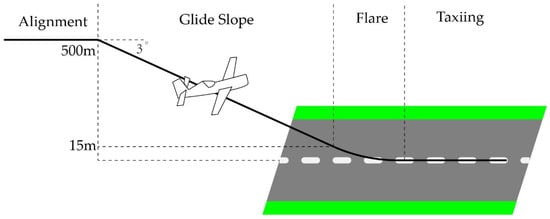 Typically, there are four segments in the landing maneuver [2] (see Figure 1): alignment, glide slope, flare, and taxiing. The glide slope and flare segments are mainly studied in this paper, as they are the most challenging segments. During landing, the aircraft needs to track the desired trajectory precisely; this desired trajectory is provided by the Instrumental Landing System (ILS). The ALS works in harmony with the ILS, which is commonly available in a rapidly growing list of airports. The ILS contains two beam transmitters to guide the aircraft during the landing procedure. One is for localizer and the other one is for glide slope. An aircraft aligns and localizes itself to a befitting altitude and approach angle, according to these transmitters. Subsequently, it starts landing and decreasing the altitude [3]. Hence, the autolanding control is inherently a trajectory tracking control problem.