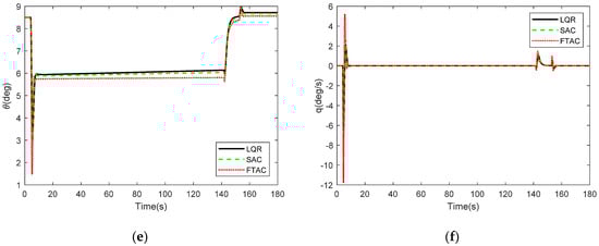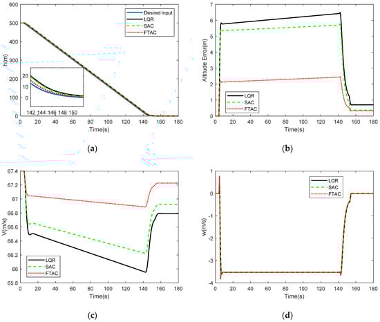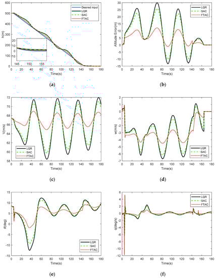 Figure 10a shows a comparison of the altitude response between the actual trajectory and desired trajectory in a windshear environment. Additionally, Figure 10b shows the altitude error of LQR, RAC, and SIRAC. It can be seen that the largest altitude error of SIRAC is less about 10 m and 15 m than RAC and LQR in the glide slope and both 3 m in the flare segment. The velocity response of SIRAC is also smoother and more closed to desired velocity than LQR and RAC, as shown in Figure 10c. The largest velocity amplitude of SIRAC is less about 5 m/s and 6 m/s than RAC and LQR, respectively. In the windshear, it is also expected that the descent rate is slow and smooth. The descent rate of SIRAC is more closed to −3.5 m/s, as the largest error of SIRAC is about 1 m/s, RAC is 2.5 m/s, and LQR is 3 m/s, as seen from Figure 10d. The pitch angle and pitch rate responses are also shown in Figure 10e,f, respectively. It is clearly seen that when the aircraft encounters a windshear, the pitch angle response has a biggest variation 8deg while using SIRAC, 15 deg using RAC, and 18 deg using LQR. Additionally, the pitch rate also has a larger variation in the transition from initial approach to glide slope and glide slope to flare segment while using SIRAC, which means that the transition time of SIRAC is shorter. As a result, it is evident that the SIRAC provides a more precise and steady landing.