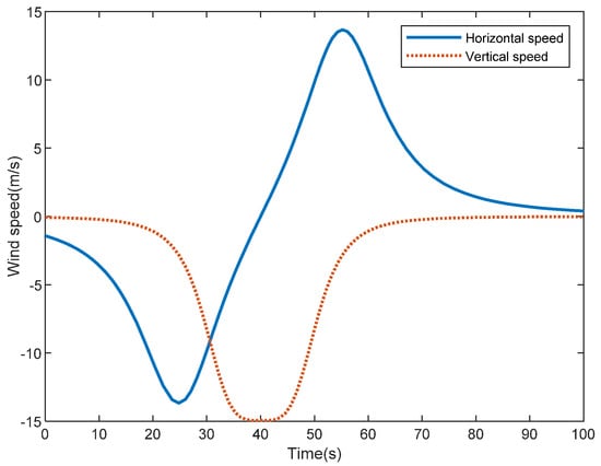 In this scenario, the landing procedure is simulated in windshear to examine the robustness of the SIRAC. Windshear is modeled, as in Section 2.2, and the approaching speed is 67.4 m/s, the time during which the aircraft will fly in the windshear and the strengths of the windshear and are both set as 1.5. Figure 9 shows the horizontal speed and vertical speed of the windshear, respectively. The aircraft will meet an increasing horizontal headwind and the maximum speed is about −14 m/s. Subsequently, the horizontal headwind will become horizontal downwind and the maximum speed is about 14 m/s. In the meantime, there is a downward flow, and the maximum speed is about −15 m/s.
