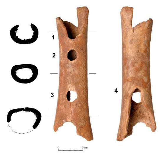 When defining the holes on the femur diaphysis no. 652, which are the key component of all wind instruments, we have to start from certain findings of research of all cave bear finds, acquired with wet sieving of all sediments during the excavations of I. Turk, as well as from the findings of his fresh bone piercing experiments. In DB, the main damage to the bones was, in addition to humans, made by wolves (all remains belong to 30 individuals at the most) and not cave hyenas (zero specimens and no indirect proof, such as coprolites and digested bones) [25], contra [16]. The complete and partial holes on the femur diaphysis are undoubtedly of mechanical origin. Namely, both have a funnel-shaped inner edge, which occurs during piercing with a tooth or a pointed tool. Experiments show that the compression of the diaphysis with sharp (unworn) teeth or striking it with a pointed tool result in the longitudinal cracking of the compact bone [20]. Longitudinal cracks are present on some of the fossil bones that were undoubtedly pierced by carnivores [16] (Figures 5 and 6 from Reference [16]). Thus, the femur or some other tubular bone, with removed meta- and epiphyses, usually breaks in half longitudinally during piercing and widening of the hole(s) [16] (Figure 6 from Reference [16]). This is, however, not true for compression and piercing with strongly worn teeth and blunt pointed tools. A crack on the posterior side of the femur diaphysis no. 652 (Figure 1), which zigzags longitudinally from one end to the other is only superficial, and occurs during weathering in the course of fossilization. It is significantly different from the continuous, rectilinear in-depth crack that occurred on fresh bones during experimental piercing with metal models of carnivore dentition. Since the femur diaphysis no. 652 is not cracked in this way, solely worn teeth or blunt pointed tools can be considered to have produced the holes.