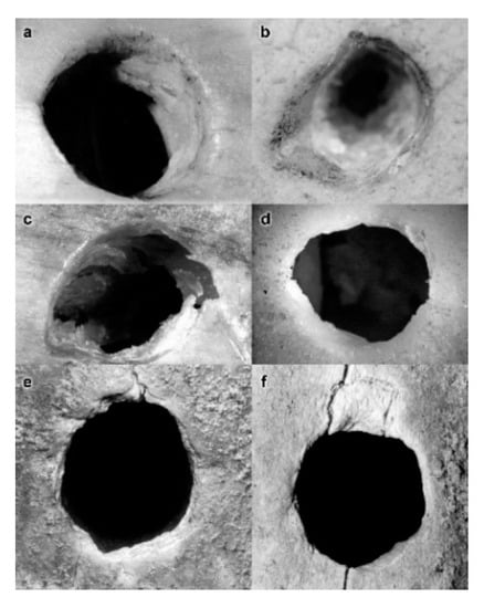Experimental holes on juvenile femur diaphysis of brown bear made by: (a) a bear’s canine tooth, hole size 8.2 × 8.2 mm; (b) a hyena’s lower canine tooth, hole size 6.5 × 8.3 mm; (c) a hyena’s 3rd upper premolar, hole size 6.5 × 9.0 mm; (d) a hole made by a pointed stone tool and bone punch, size 6.0 × 7.4 mm (e,f) complete holes no. 2 (size 8.2 × 9.7 mm) and 3 (size 8.7 × 9.0 mm) on the femur from DB no. 652 (ZRC SAZU, Archive of Institute of Archaeology).