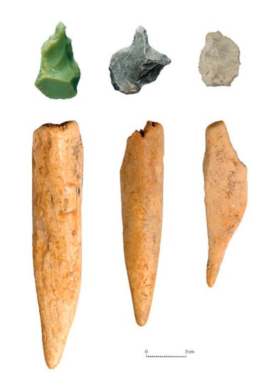 Tools suitable for perforating cortical bone: Pointed stone tools (the first on the right has a broken tip) and bone punches from the Mousterian layers of Divje babe I (photo Tomaž Lauko, NMS).