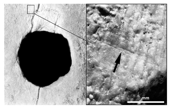 At first glance, such artificially made holes on the diaphysis resemble holes made with teeth. The latter are almost always in the vicinity of the epiphyses and only exceptionally on juvenile diaphyses of the approximately same size, such as specimen no. 652 [16]. This is conditioned with the ability of large carnivores, i.e., physical restriction regarding the grip and muscle strength, and with the thinner cortical bone near epiphyses. Unlike animals, man was able to pierce holes along the entire femur diaphysis, regardless of the thickness of the cortical bone. While puncturing bones, people could choose among significantly more methods than animals, which instinctively always do exactly the same. Therefore, in the case of the artefact, it is easier to substantiate the problematic damage, including the above-mentioned depression near hole no. 3 on the posterior side of the diaphysis. Namely, in its vicinity, there are two parallel micro-scores on the abraded surface of the cortical bone (Figure 5), which could be interpreted as cut marks made by stone tools. These micro-scores are never mentioned by advocates of the carnivore origin of the holes. The possibility that people used a femur, the distal end of which was previously damaged by carnivores, is not ruled out. Regarding the absence of other microscopic traces related to manufacture, they could have been erased due to extremely strong corrosion in the layer comprising the find. Only the more distinct scores were preserved, as well as the dent(s) (pitting after F. d’Errico [18]) made by teeth, which, considering their position, cannot be connected with certainty to the production of holes by compression and piercing with teeth. Due to their orientation and shape, all scores and dents, recognized by d’Errico and colleagues, cannot be attributed to carnivores. Carnivores make scores with their teeth that are perpendicular or slightly oblique to the axis of the diaphysis. They are not able to make a score subparallel to the axis of the diaphysis with their bites [10] (Figure 9 from Reference [10]). Some of the dents must have been made by corrosion, which was not considered by d’Errico and colleagues [39]. At least one longitudinal score could be a tool mark.