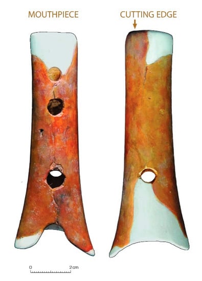 Supporters of the anthropic origin of the holes were also mistaken; e.g., about the original number of holes [4] and the original length of the musical instrument [35]. The first reconstructions of the find intended to research its musical capabilities, which places the mouthpiece into the large notch on the distal metaphysis, and which consequentially did not consider the opposite hole (at the time supposed to be a thumb hole because of its proximity to the mouthpiece), were also erroneous [31,32,34]. Due to the wrong orientation, the capability of the find as a musical instrument was reduced, and a remnant of the straight edge sharpened from both sides on the proximal part of the diaphysis, which functions on the musical instrument as the cutting edge of the mouthpiece, was overlooked [10,37] (Figure 9 from Reference [10]). It should be noted that we are dealing here with the first example of a bevelled mouthpiece edge. A bevelled mouthpiece edge, which enables better musical performance of the instrument is not known in later Upper Palaeolithic wind instruments, which are made of mammal limb bones. At already thin bone cortex of bird bones, the additional sharpening of the mouthpiece edge is not necessary to achieve better sonority.
