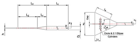 The geometrical configuration is shown for the present models in Figure 1 where the dimension data are presented in Table 1 [20]. The obstacles installed inside the diffuser are in shape of columns transversely blocking the cross-section where the diameter of circles or the short-axis length of ellipses is each fixed to 5 mm. The blockage ratio defined as the area ratio blocking the cross section at the transverse position of interest is set as a fixed value 0.3, and the multiple obstacles of circular or longitudinally elliptic cylinders are installed transversely inline, respectively, where the gap of obstacles are parameterized from 2 mm to 7 mm with 1 mm intervals (six cases each). Therefore, test cases are 12 in total for two kinds of obstacles: circular and 2:1 elliptic cylinders to analyze the flow uniformity and the mixing performance.