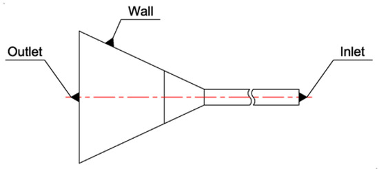Boundary conditions are marked and pointed in Figure 2 where the obstacles are omitted in Figure 1, simply applied with no-slip conditions. The flow properties are listed in Table 2, and the mass flow rate is that used for the commercial 115 mm thickness urethane boards. The Reynolds number based on the inner diameter of the feeding pipe and its critical value are defined from the power law of Equation (3) as follows, respectively [23]: