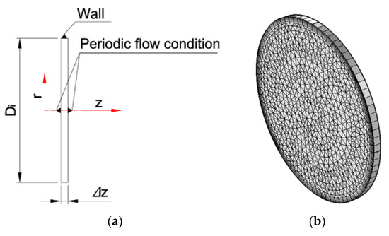 A simplified model is proposed to verify the present method for Hagen–Poiseuille solution in a non-Newtonian fluid: see Figure 4a. To get the fully developed flow domain, periodic flow condition is applied in both inlet and outlet boundaries, and the length is set 0.5 mm. The corresponding mesh system is plotted in Figure 4b, which is the identical level of the meshes in Section 2.4.