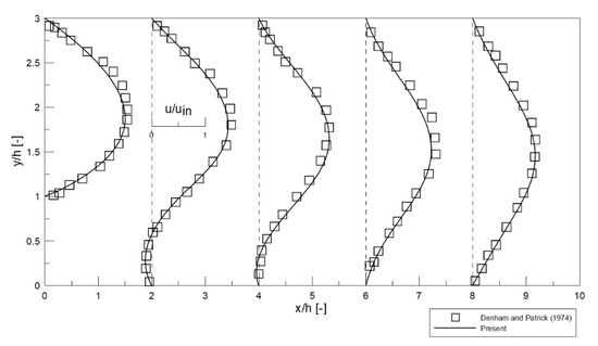 The expansion angle for the present diffuser is , and we validated our numerical method for a far severer problem of a sudden expansion flow at a backward step, one of the experimental result from Denham and Patrick [26]. Although the fluid is Newtonian, the Reynolds number is calculated to 73 based on its two-dimensional step height, ranged between 10 and 100. In Figure 6, the relative error with the present result of streamwise velocity distribution, u, lies within 10% at all the wake stations from those of experimental result [26], so the computational method can be trusted as a proper one in the diffuser expansion part. The total meshes are 36,000, and uniform meshes are applied in . However, for the whole computational domain, there are located multiple cylindrical obstacles, this validation just works in the limited domain.