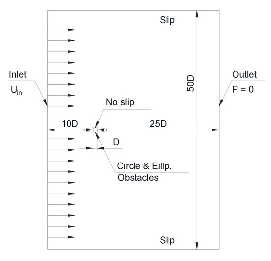 The flow around an element of obstacle is the key point of this research inside the diffuser. Computational domain and boundary conditions are such as Figure 7, setup to validate the flow around circular and elliptic obstacles [27], and Figure 8 shows the mesh used for numerical analysis where the mesh quality used for validation is equivalent to that used for the main problem.