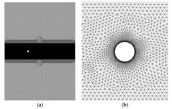 Grids system for the validation problem: (a) distribution of 31,904 elements, (b) zoomed view around a body.
