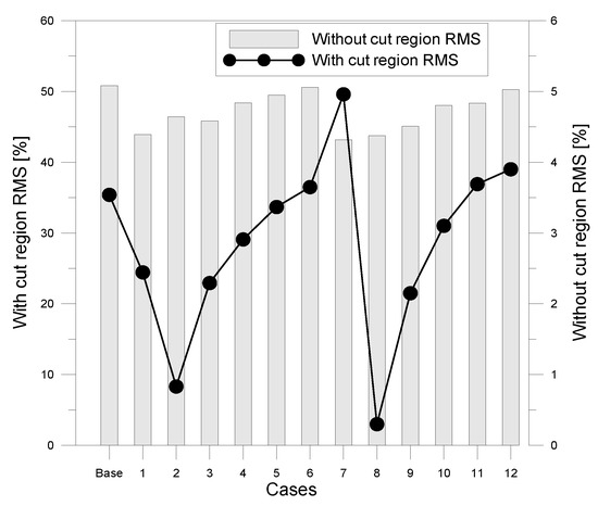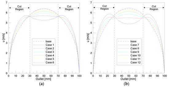 As seen in Figure 11a,b, Cases 1 and 7 reveals that there are overshoots of velocity at the boundary layer region, and the central velocity deficits due to the continuity of flow. In Figure 12, the difference of RMS value is not remarkable without cutting the edge or filter out the effect of the side diffuser walls, but with cutting the boundary data, Cases 2 and 8 are picked as the least RMS, which means the optimal flow uniformity, or the flattest central velocity profile at the wake of obstacles array.