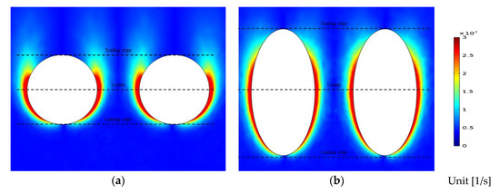 Cases 2 and 8 in Figure 12, which are picked as the best cases for the flow uniformity, are compared for velocity and vorticity field in Figure 13 and Figure 14. In Figure 13a,b, the flow is observed to be accelerated at the narrow gaps between each obstacle. The elliptic cylinders scatter the accelerated flow region far longer because its longitudinal axis distance is longer than that of circular ones. Figure 14a,b shows the vorticity, or the geometrical norm of curl , to see the rotational mixed flow: for Case 2 (circular), it is observed that a microscopic flow separation develops a weak vortex shedding at the wake direction while the vortices generated from the boundary layer in Case 8 (elliptic) is shown to be attached at the long streamwise surface to delay the flow separation. It is understood that this slight difference results in more stable uniform flow at the wake of elliptic cylinders than that of circular ones. The penetrated vorticity providing the rotation to the flow wake is considered as the most dominant cause to increase mixing in the laminar flow. The larger the vorticity and the longer the rotational region will improve the mixing characteristics.