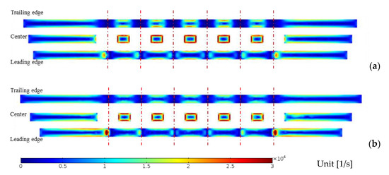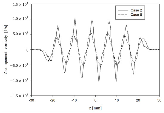 As the height of diffuser is short in the z-direction, the only observation at the xy plane is not regarded as proper because the flow must be three-dimensional in the narrow channel. Figure 15a,b represents the magnitude of vorticity from Figure 14a,b along the transverse section at the position of leading edge, center, and trailing edge of obstacles, respectively. The three components of vorticity are denoted as , marked in Figure 16.