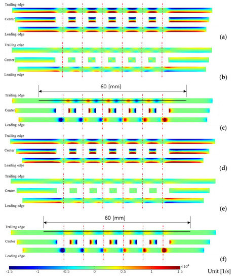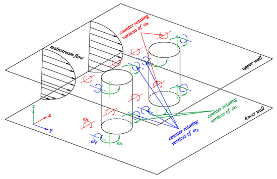 The effects obviously on the two-dimensional uniformity mentioned in the previous section, but the narrow gap between upper and lower plates of diffuser results in , which is almost independent on the existence of obstacles. However, the crossflow or three-dimensional effect can be found in Figure 15a,b where it is denoted as , consisting of a horse sue figure of vortex filament with in Figure 16. The strength of them is compared in Figure 17a–f where is only marked significant at the leading edge position, but is diffused at the downstream: see Figure 17b,e. In Figure 17a–f, the magnitudes of and seems to be similar orders. Overall, the magnitudes are compared as , and, therefore, the vorticity components (major) and (minor) contributes to the mixing with the installation of obstacles inside the diffuser.