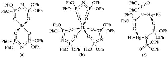 The short-chain EIPAs form metal complexes containing deprotonated {OP(OR)2}2N− ligands. The spatial structure of a complex depends on the chemical properties of a metal. Phosphonyl oxygen atoms coordination –P=O∙∙∙M∙∙∙O=P– takes place in the complexes of {OP(OPh)2}2NH with Na, Ba, Ca, Cu, Fe (Figure 1a) [22,23]. EIPAs also form lanthanide complexes similar to those with other metals (Figure 1b) [6,24]. However, reaction of {OP(OPh)2}2NH with phenylmercury hydroxide PhHgOH leads to formation of covalent N–Hg–Ph bonds along with coordination of one phosphonyl oxygen atom with a mercury atom of a neighboring molecule (in this case, a dimeric association in the crystal structure is observed, Figure 1c) [25].