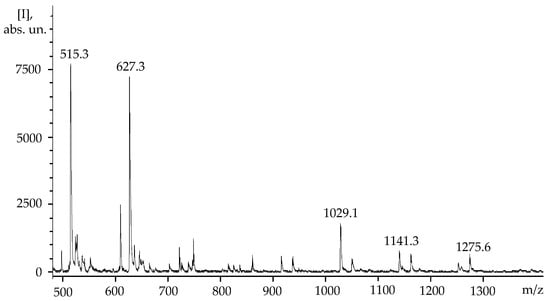 The main peaks with m/z 515 and 627 correspond to tri- (5) and tetra-substituted (3 and 4) derivatives of TCDP in protonated form, while the other peaks in the spectrum refer to complex dimer-type ions based on the represented molecules: 1029.1 ([5 + 5]H+), 1141.3 ([5 + {3 or 4}]H+, 1275.6 ([{3 or 4} + {3 or 4}] Na+). According to the results of MALDI-TOF mass spectrometry, EIPA-2 product represents a mixture of oligomeric imidophosphoric esters with 4, 5 and 6 phosphorus atoms in the main chain (Table 1).