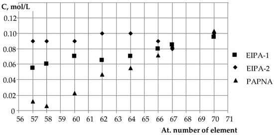 The extractant concentration in the organic phase corresponds to the concentration of H+ ions, which can be replaced by REE ions. A volume ratio of organic and aqueous phases was 1:1. It is clearly shown (Figure 6) that EIPA-1 and EIPA-2 compounds are characterized by higher extraction ability and lower selectivity than PAPNA during REE extraction.