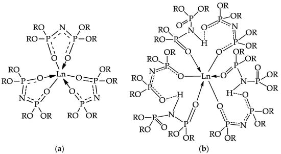 The calculation of the extractant and REE concentrations ratios studied in the organic phase after extraction (Table 3) showed a higher selectivity of EIPA-1: heavier elements are more easily transferred to the organic phase. The reason for this is the higher steric availability of large-diameter lanthanide atoms (Figure 7a, shows a complex with a tetra-substituted TCDP derivative). The proposed structure is generally recognized for the complexes of this type of compounds (with two phosphonyl groups) with a light group of REE [5,23]. The aforementioned extractant to REE concentrations ratio in the organic phase very accurately confirm the formation of complexes of precisely 3 EIPA molecules and 1 metal ion. A similar structure with phenyl substituents at phosphorus atoms was described by Efimova et al. [44]. The small size of the lanthanide atom presumably can lead to the formation of complexes containing up to 6 fragments of extractant molecules (Figure 7b), in which the formation of hydrogen bonds between P=O and H–N occurs. This is confirmed by the higher ratios of CEIPA-1: Corg with values of 5.03 for La and 5.08 for Ce (Table 3). Chen et al. previously described the analogous structure of the REE complex with 2-ethylhexylphosphonic acid mono-2-ethylhexyl ester [28].