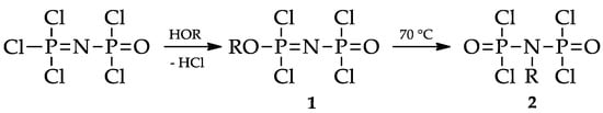 At elevated temperatures, PPR probability (70 °C and higher) approaches 100% even for the mono-substituted phosphazene and decreases slightly when all chlorine atoms in chlorophosphazene have been replaced by 2-ethylhexyl substituents. Thus, the resulting product of the reaction between 1 mol of TCDP and 0.75 mol of 2-ethylhexanol at 70 °C in dioxane is actually a mixture of the original TCDP and its mono-substituted derivative, tetrachlorodiphosphonyl-N-(2-ethylhexyl)-amine (2), which has a singlet signal at –5.2 ppm in the 31P NMR spectrum (Figure S2) due to the magnetic identity of the phosphorus nuclei. The formation of 2, in this case, occurs according to Scheme 3.