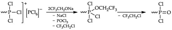 The same products (TCDP, POCl3) and trifluoroethyl chloride were yielded from the reaction of 1 mole of [Cl3P=N–PCl3]+[PCl6]− and 2 moles of sodium trifluoroethylate. In this case, the formation of the terminal phosphonyl group accompanied by trifluoroethyl chloride elimination (Scheme 5).