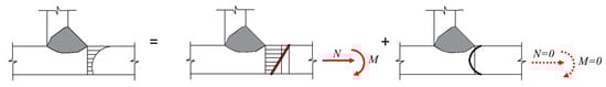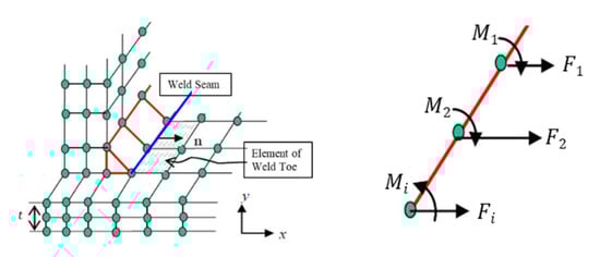 The inner stress of the weld toe along the direction of the thickness was divided into the normal stress, σx(y), and shear stress in plane, τxy(y), as shown in Figure 1. Based the equilibrium conditions of forces and moments, the normal stress was simply divided into the membrane stress, σm, and bending stress, σb. The in-plane shear stress was simplified as the vertical shear stress, τm. However, the effect of the shear stress was generally ignored as it would have little influence on the propagation of the fatigue cracks. The traction structural stress was defined as the sum of the membrane stress σm and bending stress σb, as in Equations (1)–(3). The nodal forces and moments of the nodes of the weld seam and weld elements can be obtained, as shown in Figure 2.
