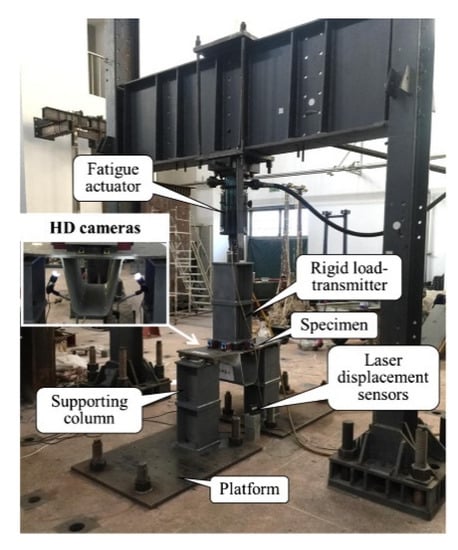 Fatigue tests of rib-to-deck welded connections in orthotropic steel bridge decks were carried out in the literature [8], as shown in Figure 3 Fatigue specimens under two loading cases were loaded and then fatigue cracking process, fatigue failure mode, characteristic fatigue life, and rigidity degradation were investigated. The structural hot spot stresses were investigated for fatigue behavior analysis.