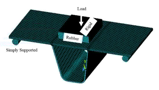 The results showed that the fatigue performance of the rib-to-deck connection was significantly affected by the types of the weld seam. Furthermore, many other design parameters related to the effect of the crossbeam or their combination may influence the fatigue performance of OSB. In order to investigate the effect of geometric parameters of the weld seam on the fatigue performance of rib-to-deck connection, a partial model of the OSBD was developed as shown in Figure 17. As in the local model, the finite element used was SOLID 185 and the mesh at the connection of the rib-to-deck was refined. The model was simply supported and the fatigue load was applied to the middle of the top side of the bridge deck, as shown in Figure 18. The fatigue load was applied based on the orthotropic steel bridge specification, Eurocode3. Overall schemes of various detail parameters were established. The radius (γ) ranged from 5 to 25 mm, the groove angle (α) was within 20–65°, the thickness of the deck plate (h) varied within 12 to 24 mm, and the thickness of the U-rib (t) was 6–16 mm (Table 2).
