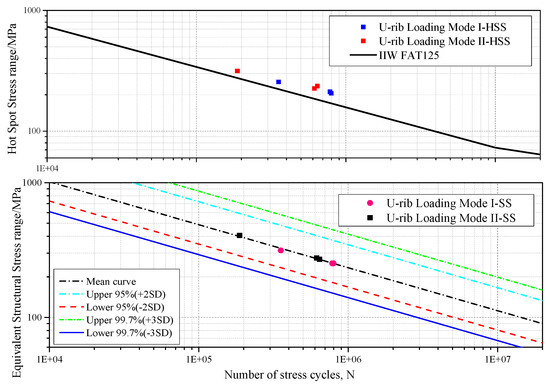 The finite simulation results, including the equivalent structural stress and fatigue cyclic life, are shown in Figure 5 using the master S-N curve. The marking in the chart, U-rib loading mode I-HSS, represents the hot spot stress of the U-rib connection under the loading I. The label, U-rib loading mode II-SS, represents the equivalent structural stress of the U-rib connection under the loading II. Table 1 plots the fatigue test cyclic life of the fatigue test results and the hot spot stresses obtained during the tests. In addition, the equivalent structural stress of the numerical results using the traction structural stress method is shown in the table. The points in Figure 5 are determined based the actual fatigue test life and numerical stress results, including the hot spot stress and equivalent structural stress.