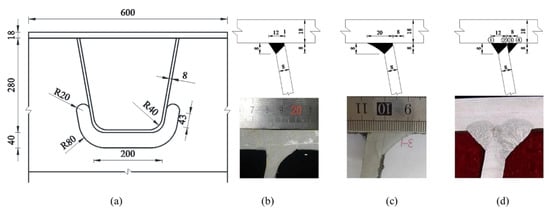 Figure 6 shows a local model of an OSBD constructed with a bridge deck, a U-rib and a crossbeam. The overall size of the local model was 600 mm (length) × 400 mm (height) × 200 mm (width) based on the size of an actual bridge. The sizes of the bridge deck, crossbeam and U-rib were 18 mm, 14 mm and 8 mm, respectively. The model of the OSBD and three typical weld seams of the connections between the bridge deck and U-rib are plotted in Figure 6.