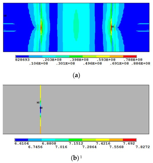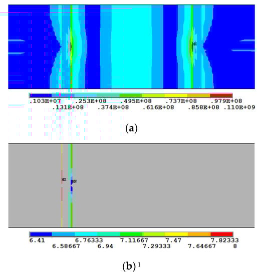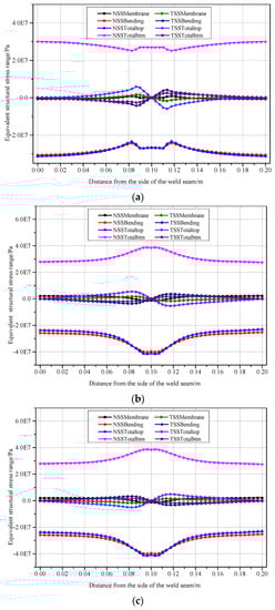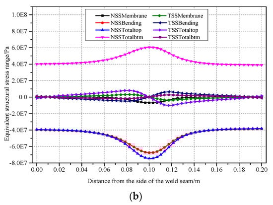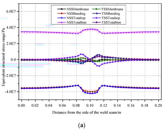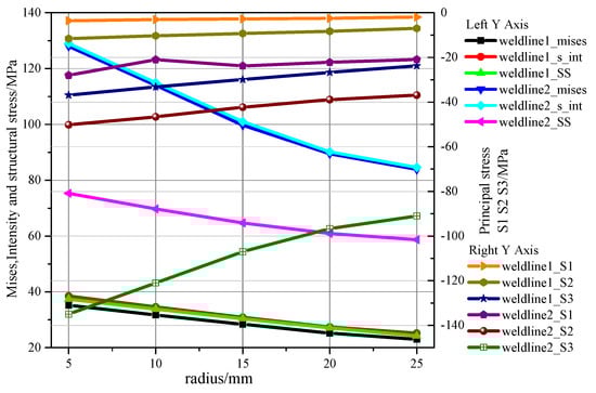 Figure 22 shows the trends of various stresses with the radius of the weld seam. The results indicate that the Mises stress, stress intensity and equivalent structural stress of Weldline1 were relatively small and decreased sharply with an increase in the radius. The trends of Mises stress and stress intensity were similar. The Mises stress, equivalent structural stress and stress intensity decreased with an increase in the radius. The principal stresses decreased with an increase in the radius. In addition, the third principal stress (S3) of Weldline2 decreased sharply by 32.6% with an increase in the radius from 5 mm to 25 mm.