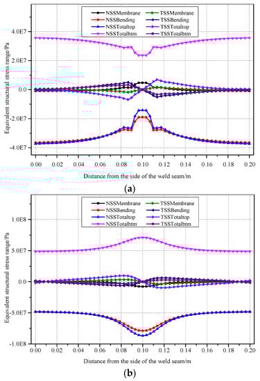 The Mises stress diagram of the connection of the bridge deck and U-rib under fatigue load was obtained with the finite element simulation method. The equivalent structural stress contained membrane stress and bending stress. The equivalent structural stress and the stress components of the bottom side of the bridge deck were obtained based on the traction structural stress method. The fatigue cyclic life was calculated using the master S-N curve and Equation (4). Furthermore, in the figure, the vertical axis represents the equivalent structural stress and the horizonal axis represents distance from the side of the weld toe or weld root. The NSS represents the normal structural stress and TSS represents the in-plane shear structural stress. “Membrane” stands for the membrane structural stress and “bending” represents the bending stress. “Total” means the sum of the membrane stress and bending stress. The equivalent structural stress of the bottom and the top side of the bridge deck were obtained similarly.