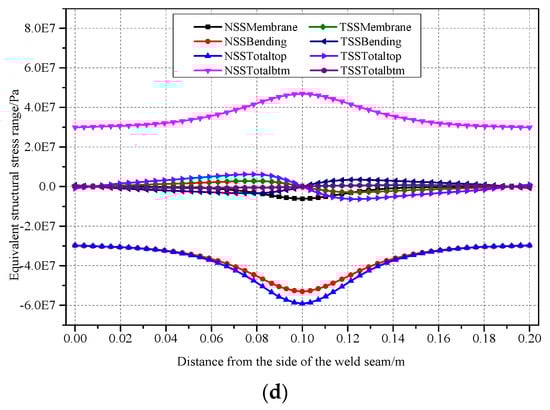 Equivalent structural stress of the weld root and weld toe of double-sided weld seams. (a) Equivalent structural stress of Double-Weldline1, (b) equivalent structural stress of Double-Weldline2, (c) equivalent structural stress of Double-Weldline3, (d) equivalent structural stress of Double-Weldline4.