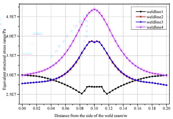 Figure 15 shows the equivalent structural stress of various weld seams of the bridge deck with double-sided weld seam. The trend of normal structural stress of Double-Weldline1 was opposite to that of the other three weld seams. The maximum normal stress at both sides of the Double-Weldline1 was 30 MPa and the stress gradually decreased to the middle of the weld seam. The minimum normal stress is 25.2 MPa. The normal stress increased reversely compared to the other three seams and remained uniform. The trends of the equivalent structural stress of Double-Weldline2 and Double-Weldline3 were similar and the normal stress values were close to each other. The normal stress increased gradually from the side of the weld seam to the middle section and the growth rate increased gradually. The maximum normal stress was 38.74 MPa and 38.68 MPa, respectively, for Double-Weldline2 and Double-Weldline3. The normal stress at the middle section decreased slightly.