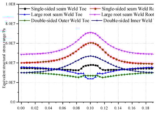 Figure 14 shows the equivalent structural stress for the four weld lines from Double-Weldline1 to Double-Weldline4. The stress trends of Double-Weldline1 to Double-Weldline4 were similar to the other weld seams. The bottom of the bridge deck was mainly subjected to normal tensile stress with little normal shear stress. The normal stress was mostly tensile stress with significant structural stress value.