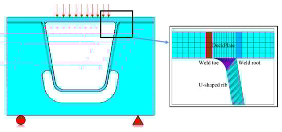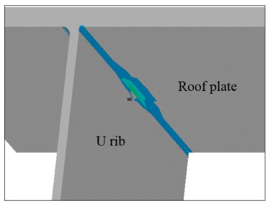 As mentioned above, fatigue cracks occurring at the connection of the bridge deck and U-rib account for 30.2% of all the observed cracks. In order to obtain the equivalent structural stress of the weld seam, the hypothetical fatigue crack initiation and propagation on the bridge deck were determined as shown in Figure 8. The fatigue crack was initiated in the weld toe or weld root and propagated to the base [20]. This crack continued to expand along the weld line until the specimen was failed. Figure 8 shows the hypothetical positions of fatigue crack initiation and the propagation direction on the bridge deck.