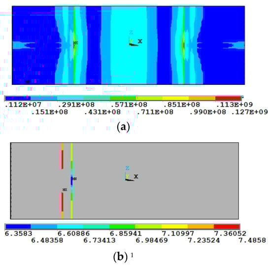 As shown in Figure 5, the left weld seam (Trad-Weldline1) is a traditional single-sided weld seam of the weld toe and bridge deck. The right weld seam (Trad-Weldline2) is a traditional single-sided weld seam of the weld root and bridge deck. Figure 9 shows the Mises stress and fatigue cyclic life of the bottom side of the bridge deck of a traditional weld seam. It can be seen clearly that the maximum stress of the conventional single-sided weld seam occurred in the middle of the conventional weld seam between the bottom of the bridge deck and the groove weld seam.