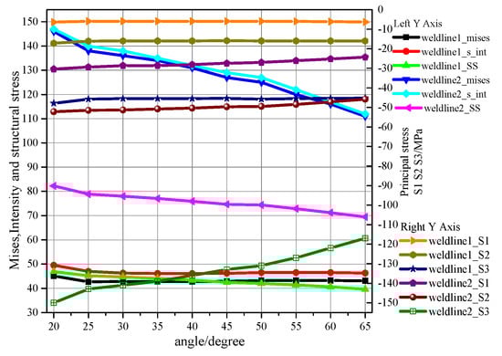 The comparative contours show that the Mises stress, stress intensity and equivalent structural stress of Weldline1 were small and decreased slightly with an increase in the groove angle. The trends of Mises stress and stress intensity of Weldline2 were similar. The Mises stress, equivalent structural stress and stress intensity of Weldline2 decreased with an increase in the angle. The principal stresses of Weldline2 remained constant with an increase in the groove angle.