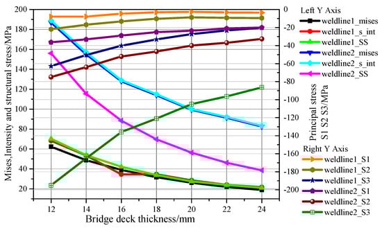 Figure 23 shows the trends of various stresses with the bridge deck thickness. The Mises stress, stress intensity and equivalent structural stress of Weldline1 decreased by up to 70% with an increase in the bridge deck thickness, respectively. The trends of Mises stress and stress intensity of Weldline2 were similar. The Mises stress, equivalent structural stress and stress intensity decreased by approximately 55% with an increase in the bridge deck thickness. The principal stresses of Weldline1 and Weldline2 decreased slightly with an increase in the bridge deck thickness.