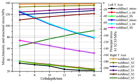 The trends of various stresses with the U-rib thickness are shown in Figure 24. The comparative results demonstrate that the Mises stress, stress intensity and equivalent structural stress of Weldline1 decreased slightly with an increase in the U-rib thickness. The trends of Mises stress and stress intensity were similar. The Mises stress, equivalent structural stress and stress intensity of Weldline2 decreased by 44% with an increase in the U-rib thickness. The principal stresses of Weldline2 decreased slightly and the 3rd principal stress decreased by 34.5% with an increase in the U-rib thickness from 6 mm to 26 mm.