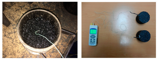The temperature was measured by introducing a thermo-sensor inside the specimens at the time of manufacturing the mixture (Figure 1). With these thermo-sensors, it is possible to determine the internal temperature of the specimens (logging interval one minute). Knowing this, the time of each freeze–thaw cycle is established so that both phases, hot and cold, have enough time to reach the defined temperatures. Each freeze–thaw cycle requires 48 h to be completed, 24 h for the hot time period and 24 h for the cold time period (Figure 2).