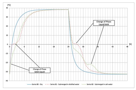 The time that each submerged series remained in frozen water was defined by the steps of solid–liquid and liquid–solid changes. In the case of the B1 series, the time submerged in frozen water is 22 h, and in the B2 series, it is approximately 15 h.