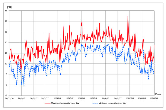 The outside storage series, the C-Series, remained outside in Santander (Spain) for one year, from 20 December 2016 to 20 December 2017, and was protected from precipitation. The maximum and minimum daily temperatures during this period were collected by the Spanish Meteorological Agency AEMET (Figure 3).
