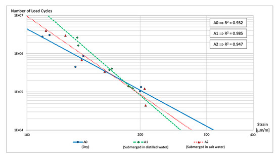 In the A-Series, for low values of strain, the submerged series, especially A1, obtain more load cycles than the dry specimens (Figure 4).