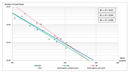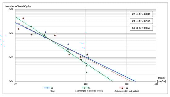 The fatigue lines (Strain—Number of Load Cycles) obtained for all of the series are very similar, reaching notably high R2 values; although, in the case of the C-Series, it is slightly lower. This may be due to the fact that the temperature interaction process is longer than in the A-Series and B-Series.