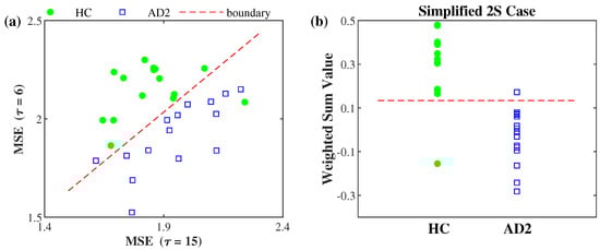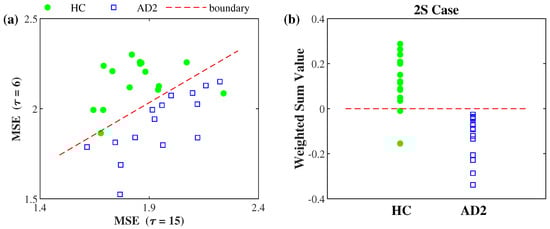 Figure 1 illustrates the optimal training result of the 2S case listed in Table 3. Figure 1a illustrates the MSE ( = 6) vs. the MSE ( = 15) of the 30 EEG signals recorded from the T4 electrode. The 30 signals are from 15 HC and 15 AD2 subjects. Figure 1b illustrates the weighted sum values of the 30 signals. The red dashed line is the differentiating boundary with threshold value 0; the data points above the red line with positive values are differentiated into the healthy group and the data points below the red line with negative values are differentiated into the AD group. In other words, the absolute value of the weighted sum value of each data point shown in Figure 1b is the distance between the corresponding point and the boundary line shown in Figure 1a. Note that the differentiating performance is the same as the performance of LOOCV listed in Table 1.