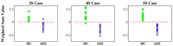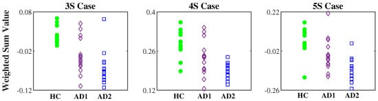 Table 4 further compares the means ± SDs of the weighted sum values among the HC, AD1, and AD2 groups for each of the 2S–5S cases. For each case, the weighted sum value of the healthy group is significantly higher than that of the mild AD group, while that of the mild AD group is significantly higher than that of the moderate to severe AD group (p-value < 0.05).