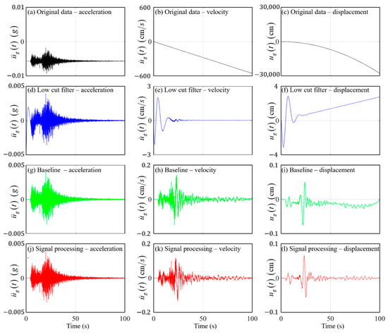 Figure 2 shows the East–West (E–W) direction component of ground acceleration (), velocity (), and displacement () at station BUS2. Figure 2a–c show raw record data for ground acceleration, velocity, and displacement. Figure 2d–f show the records after applying a low-pass filter, whereas Figure 2g–i show ground motions after applying base line correction. Figure 2j–l show ground motions after applying a low-cut filter, as well as base correction. It can be observed that ground motions are properly adjusted by using both a low-cut filter and base correction.